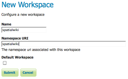 From the GeoServer main screen use the option to create a new Workspace called "spatialwiki" and associate it with a URI also named spatialwiki. In general we'll be creating a Workspace that contains a database connection called a Store (data), and a Layer with symbology that references data in a particular Store.